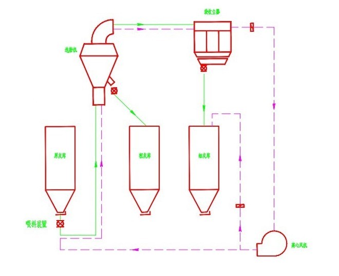 原灰經(jīng)氣力泵送入粉煤灰選粉機(jī),經(jīng)選粉機(jī)分選后,細(xì)灰隨氣流進(jìn)入在另一庫頂布置的布袋收塵器收集,經(jīng)卸灰閥至細(xì)灰?guī)。粗灰從選粉機(jī)粗粉口排入粗粉庫。