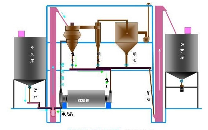 粉煤灰磨細(xì)、分選工藝說明:粉煤灰粉磨系統(tǒng)主要由原灰倉(cāng),葉輪給料器、電子計(jì)量稱、粉煤灰專用球磨機(jī)、選粉機(jī)、氣箱脈沖布袋除塵器、引風(fēng)機(jī)、螺旋輸送機(jī)、斗式提升機(jī)、給料機(jī)、控制系統(tǒng)等組成。系統(tǒng)直接由原灰倉(cāng)下取灰,經(jīng)葉輪給料器給料,電子稱稱重后由螺旋輸送機(jī)輸送進(jìn)入磨尾提升機(jī),粉煤灰由提升機(jī)喂入選粉機(jī)進(jìn)行磨細(xì)前的分選,分選后的粗灰經(jīng)螺旋輸送機(jī)送入磨機(jī)進(jìn)料口,進(jìn)入球磨機(jī)研磨,經(jīng)磨機(jī)研磨后的物料中含有大量細(xì)灰,再次由提升機(jī)喂入選粉機(jī)分選,分選出的細(xì)灰經(jīng)后續(xù)螺旋輸送機(jī)送入成品灰?guī)欤C(jī)通風(fēng)除塵與選粉機(jī)細(xì)粉布袋除塵器共用;采用此種閉路研磨工藝與開路(無選粉機(jī))系統(tǒng)相比可提高臺(tái)時(shí)產(chǎn)量30~40%以上。